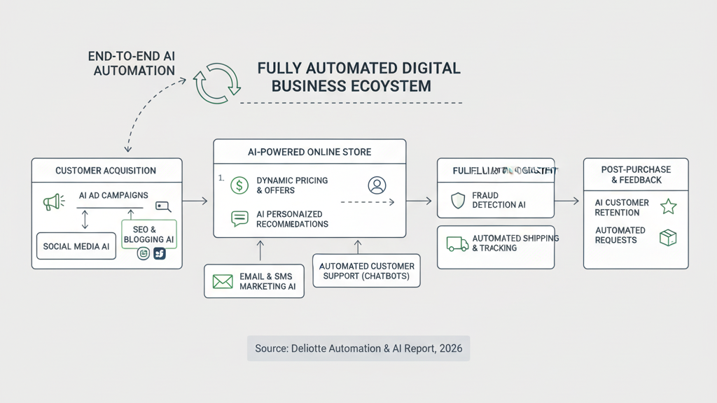 Another significant movement in AI trends 2026 is the shift toward fully automated digital ecosystems. Businesses are no longer automating single tasks; they are automating entire operations. An online store, for example, can now integrate AI that updates inventory, analyzes customer behavior, writes ad copy, adjusts pricing, sends email campaigns, and optimizes product descriptions — all running continuously without human intervention.